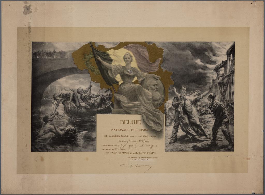 Diploma bij uitreiking van een medaille voor moed en zelfopoffering.
