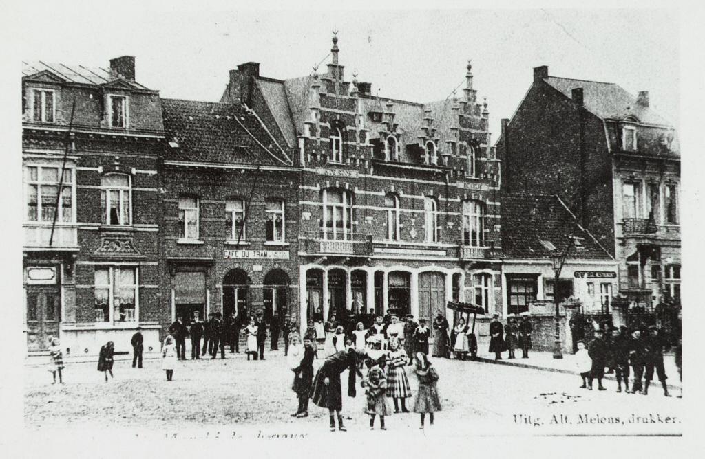 De Kerkstraat rond 1907, toen nog Paardemarkt. Het eerste herenhuis links was de woning van drukker Melens. Dat men op de Paardenmarkt de dorstige graag laafde, blijkt uit de volgende woningen. De naam "Café du tram", bij kleermaker herbergier L. Mariën, verwees naar de tramhalte aldaar. Daarnaast was "Afspanning Koffiehuis De Roos - Statie van den tram", bij wed. Joanna Van Mol- De Voecht. Bij haar kon men ook, aldus het uithangsbord, 'alle soorten van meststoffen' kopen. Anna Dom-Peeters hield de herberg en beenhouwerij "In de Lelie". Naast dit nieuwe gebouw, opgetrokken in 1906, viel "Café Belge" heel wat kleiner uit. De hoge herenwoning ernaast was de eerste woonst van dokter Jacobs.
