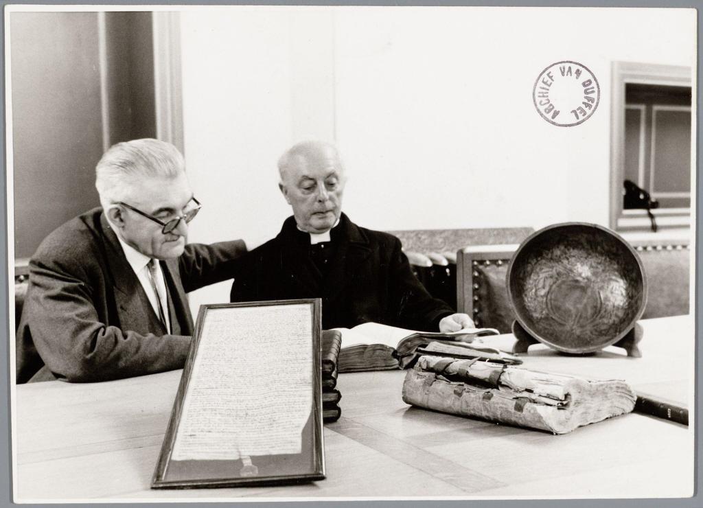 Archivarissen E.H. Evarist Dom en Jos Resseler in het gemeentearchief